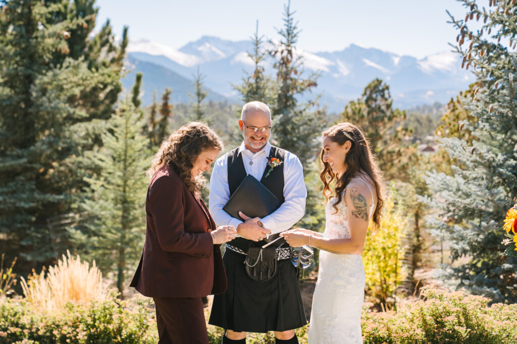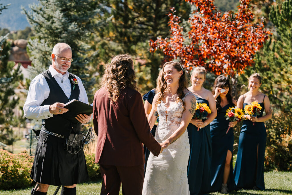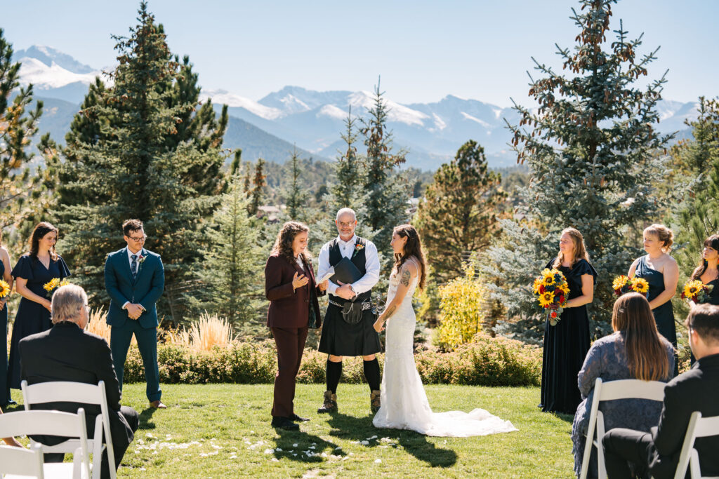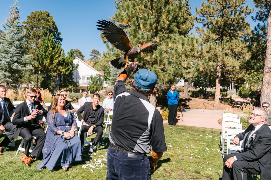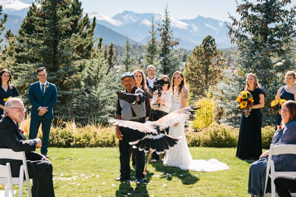 Set on the Longs Peak Lawn, their non-denominational ceremony featured sweeping mountain views and a surprise from HawkQuest! When it came time to exchange rings, a hawk from HawkQuest flew down the aisle and delivered the rings. It was a complete surprise for all of the guests!